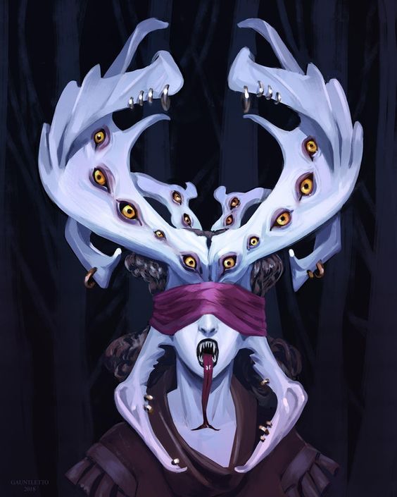 These Demons have large antler-like horns that rest atop their heads. Within their antlers there rests several sets of eyes, usually anywhere between 8-10. These Demons also have a set of jaw bones that protrude from their jaws, just below their ears. They also have long forked tongues.