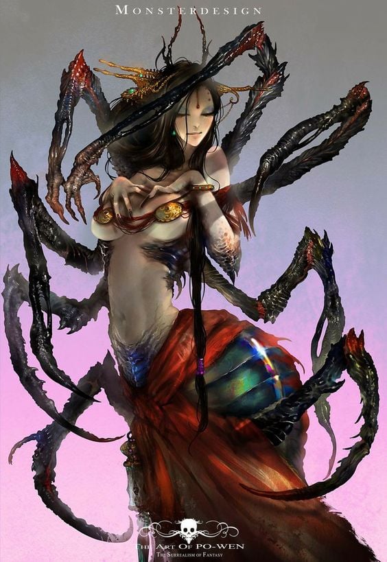 Jorogumo are Japanese Yokai (Spider Demons). They are also known as the Golden Orb-Weavers in English. These beings are known to turn into beautiful women (and men) to lure their prey into their homes, after which; most are never seen again. The Jorogumo, while often depicted as women can also be a male, though the males sometimes go unnoticed in the background.